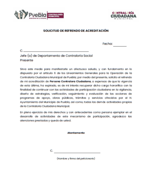I. Acreditación: al documento emitido por la persona Titular de la Contraloría del Honorable Ayuntamiento del Municipio de Puebla, que autoriza realizar acciones dentro del marco de actuación de la Contraloría Ciudadana;